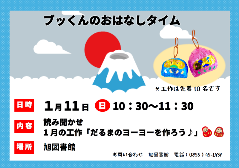 毎月第1日曜日に開催している「ブッくんのおはなしタイム」ですが、1月は11日(日曜)に開催します♪