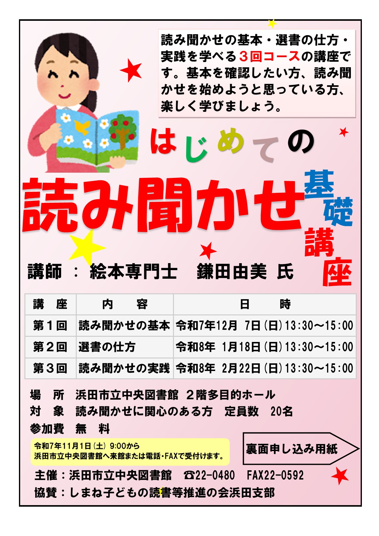 いただければと思い、この度、講師に絵本専門士の鎌田由美先生をお迎えし、