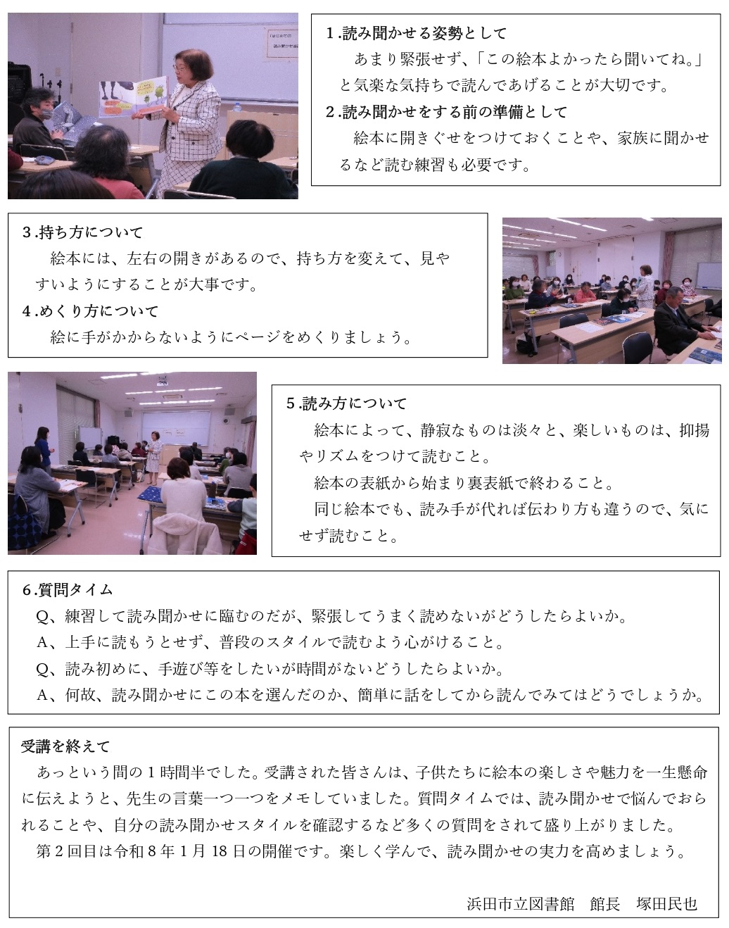 令和7年12月7日に、絵本専門士の鎌田由美先生を講師に招き、「はじめての読み聞かせ基礎講座(第1回目)」を開催しました。市内各地域で読み聞かせをされている方・読み聞かせに関心のある方・学校司書・図書館司書19名の参加があり、熱心に和気あいあいと受講されました。